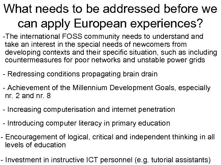 What needs to be addressed before we can apply European experiences? -The international FOSS community needs to understand take an interest in the special needs of newcomers from developing contexts and their specific situation, such as including countermeasures for poor networks and unstable power grids - Redressing conditions propagating brain drain - Achievement of the Millennium Development Goals, especially nr. 2 and nr. 8 - Increasing computerisation and internet penetration - Introducing computer literacy in primary education - Encouragement of logical, critical and independent thinking in all levels of education - Investment in instructive ICT personnel (e. g. tutorial assistants)
