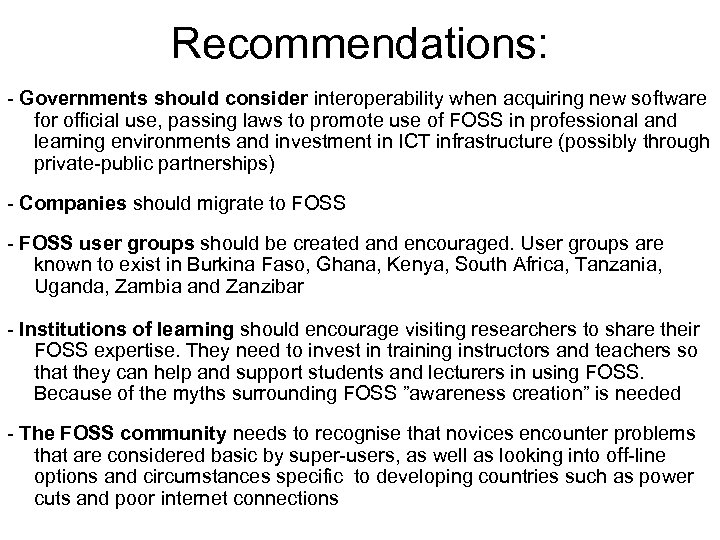 Recommendations: - Governments should consider interoperability when acquiring new software for official use, passing laws to promote use of FOSS in professional and learning environments and investment in ICT infrastructure (possibly through private-public partnerships) - Companies should migrate to FOSS - FOSS user groups should be created and encouraged. User groups are known to exist in Burkina Faso, Ghana, Kenya, South Africa, Tanzania, Uganda, Zambia and Zanzibar - Institutions of learning should encourage visiting researchers to share their FOSS expertise. They need to invest in training instructors and teachers so that they can help and support students and lecturers in using FOSS. Because of the myths surrounding FOSS ”awareness creation” is needed - The FOSS community needs to recognise that novices encounter problems that are considered basic by super-users, as well as looking into off-line options and circumstances specific to developing countries such as power cuts and poor internet connections