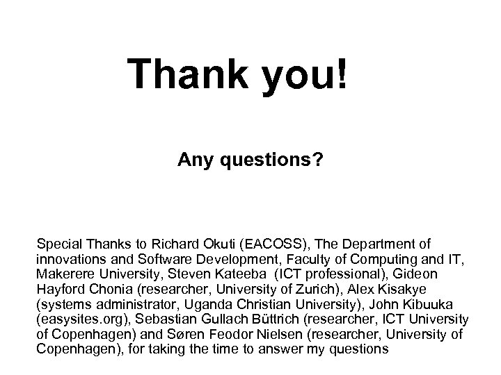 Thank you! Any questions? Special Thanks to Richard Okuti (EACOSS), The Department of innovations and Software Development, Faculty of Computing and IT, Makerere University, Steven Kateeba (ICT professional), Gideon Hayford Chonia (researcher, University of Zurich), Alex Kisakye (systems administrator, Uganda Christian University), John Kibuuka (easysites. org), Sebastian Gullach Büttrich (researcher, ICT University of Copenhagen) and Søren Feodor Nielsen (researcher, University of Copenhagen), for taking the time to answer my questions