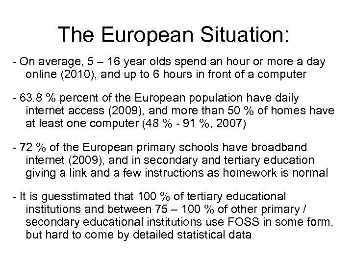 The European Situation: - On average, 5 – 16 year olds spend an hour or more a day online (2010), and up to 6 hours in front of a computer - 63. 8 % percent of the European population have daily internet access (2009), and more than 50 % of homes have at least one computer (48 % - 91 %, 2007) - 72 % of the European primary schools have broadband internet (2009), and in secondary and tertiary education giving a link and a few instructions as homework is normal - It is guesstimated that 100 % of tertiary educational institutions and between 75 – 100 % of other primary / secondary educational institutions use FOSS in some form, but hard to come by detailed statistical data