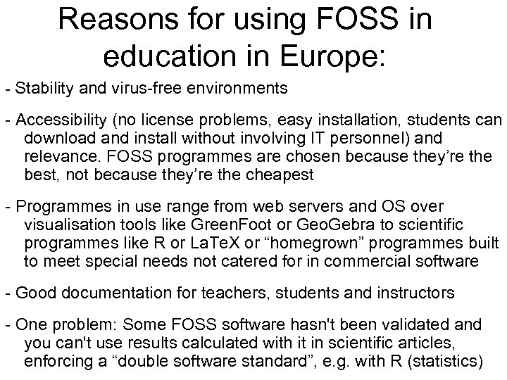 Reasons for using FOSS in education in Europe: - Stability and virus-free environments - Accessibility (no license problems, easy installation, students can download and install without involving IT personnel) and relevance. FOSS programmes are chosen because they’re the best, not because they’re the cheapest - Programmes in use range from web servers and OS over visualisation tools like Green. Foot or Geo. Gebra to scientific programmes like R or La. Te. X or “homegrown” programmes built to meet special needs not catered for in commercial software - Good documentation for teachers, students and instructors - One problem: Some FOSS software hasn't been validated and you can't use results calculated with it in scientific articles, enforcing a “double software standard”, e. g. with R (statistics)