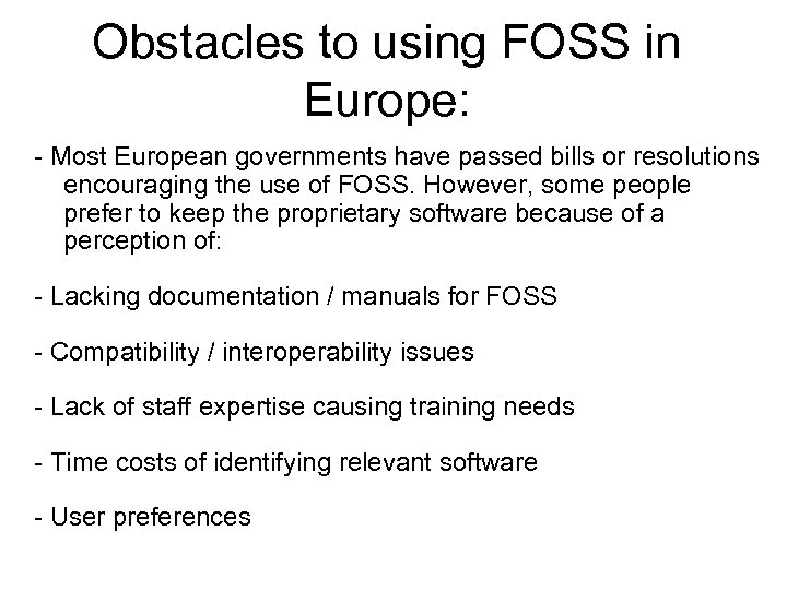 Obstacles to using FOSS in Europe: - Most European governments have passed bills or resolutions encouraging the use of FOSS. However, some people prefer to keep the proprietary software because of a perception of: - Lacking documentation / manuals for FOSS - Compatibility / interoperability issues - Lack of staff expertise causing training needs - Time costs of identifying relevant software - User preferences