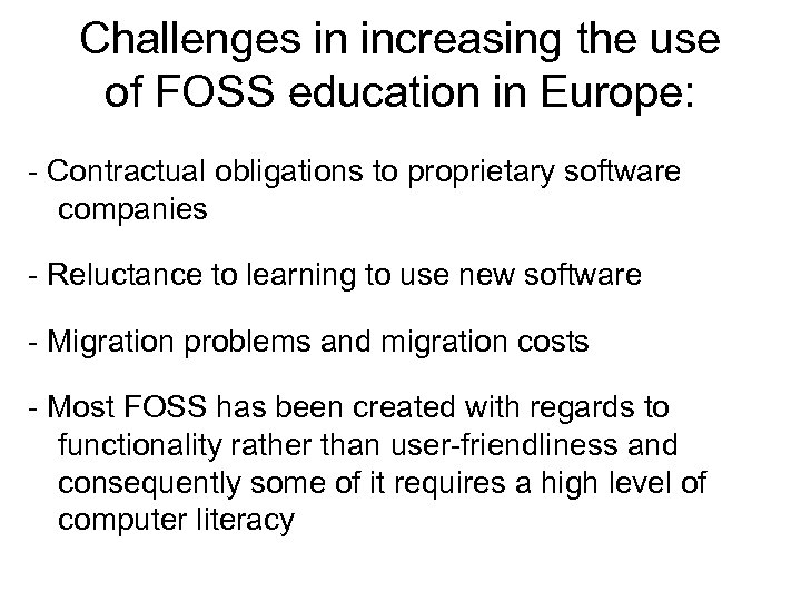 Challenges in increasing the use of FOSS education in Europe: - Contractual obligations to proprietary software companies - Reluctance to learning to use new software - Migration problems and migration costs - Most FOSS has been created with regards to functionality rather than user-friendliness and consequently some of it requires a high level of computer literacy