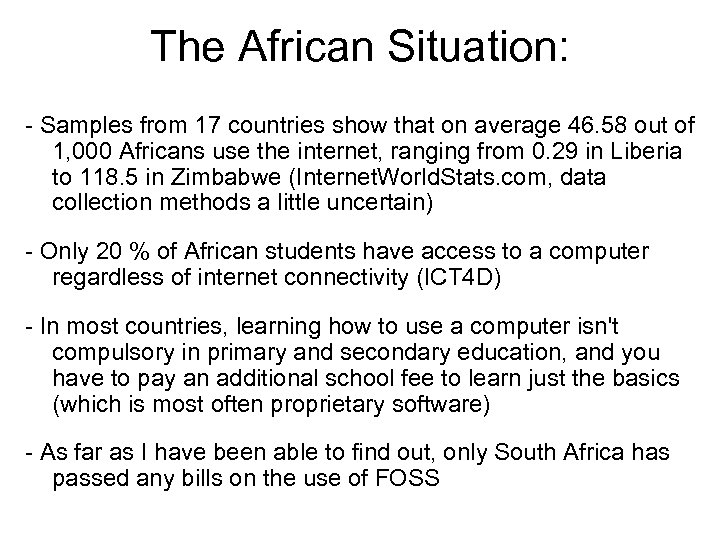The African Situation: - Samples from 17 countries show that on average 46. 58 out of 1, 000 Africans use the internet, ranging from 0. 29 in Liberia to 118. 5 in Zimbabwe (Internet. World. Stats. com, data collection methods a little uncertain) - Only 20 % of African students have access to a computer regardless of internet connectivity (ICT 4 D) - In most countries, learning how to use a computer isn't compulsory in primary and secondary education, and you have to pay an additional school fee to learn just the basics (which is most often proprietary software) - As far as I have been able to find out, only South Africa has passed any bills on the use of FOSS