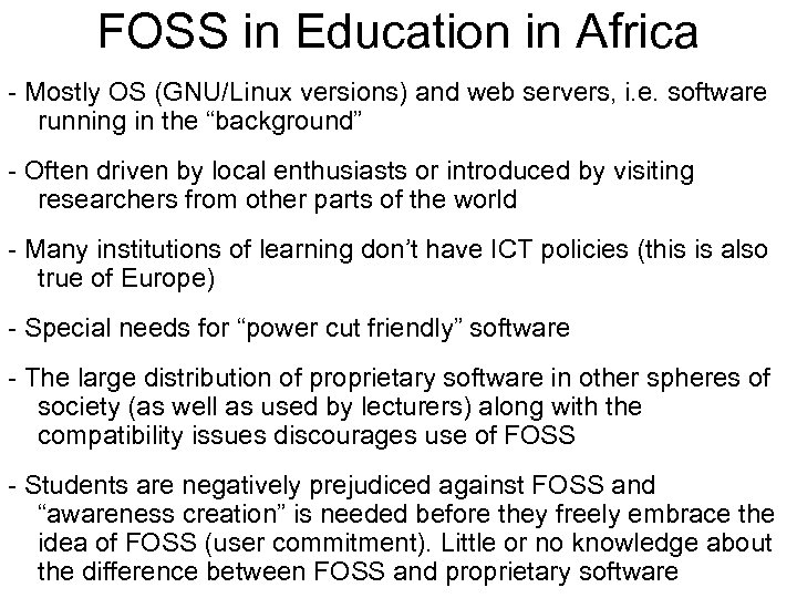 FOSS in Education in Africa - Mostly OS (GNU/Linux versions) and web servers, i. e. software running in the “background” - Often driven by local enthusiasts or introduced by visiting researchers from other parts of the world - Many institutions of learning don’t have ICT policies (this is also true of Europe) - Special needs for “power cut friendly” software - The large distribution of proprietary software in other spheres of society (as well as used by lecturers) along with the compatibility issues discourages use of FOSS - Students are negatively prejudiced against FOSS and “awareness creation” is needed before they freely embrace the idea of FOSS (user commitment). Little or no knowledge about the difference between FOSS and proprietary software