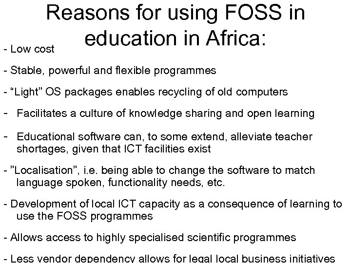 Reasons for using FOSS in education in Africa: - Low cost - Stable, powerful and flexible programmes - “Light” OS packages enables recycling of old computers - Facilitates a culture of knowledge sharing and open learning - Educational software can, to some extend, alleviate teacher shortages, given that ICT facilities exist - ”Localisation”, i. e. being able to change the software to match language spoken, functionality needs, etc. - Development of local ICT capacity as a consequence of learning to use the FOSS programmes - Allows access to highly specialised scientific programmes - Less vendor dependency allows for legal local business initiatives