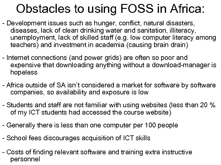 Obstacles to using FOSS in Africa: - Development issues such as hunger, conflict, natural disasters, diseases, lack of clean drinking water and sanitation, illiteracy, unemployment, lack of skilled staff (e. g. low computer literacy among teachers) and investment in academia (causing brain drain) - Internet connections (and power grids) are often so poor and expensive that downloading anything without a download-manager is hopeless - Africa outside of SA isn’t considered a market for software by software companies, so availability and exposure is low - Students and staff are not familiar with using websites (less than 20 % of my ICT students had accessed the course website) - Generally there is less than one computer per 100 people - School fees discourages acquisition of ICT skills - Costs of finding relevant software and training extra instructive personnel