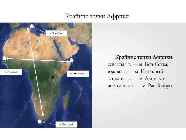 План описания географического положения материка • Название материка. • Положение относительно условных линий на карте: экватора, тропиков, полярных кругов, полюсов, нулевого меридиана, 180 -го меридиана. • Положения в полушариях Земли. • Названия крайних точек материка и их координаты. • Протяжённость материка с севера на юг в градусах и километрах. Меридиан, вдоль которого материк имеет наибольшую протяжённость. • Протяжённость материка с запада на восток в градусах и километрах. Параллель, вдоль которой материк имеет наибольшую протяжённость. • Положение материка в климатических поясах и областях климата. • Положение материка относительно морей и океанов его омывающих. • Положение материка относительно других материков Земли.