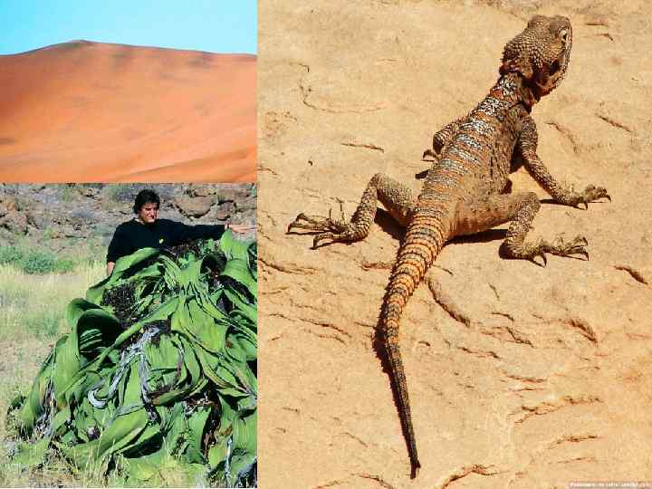 Тропические пустыни • Песчаные бури • Редкие дожди • Скудная растительность (вельвичия, молочай…) • Оазисы • Верблюды, антилопы, грызуны, ящерицы, змеи