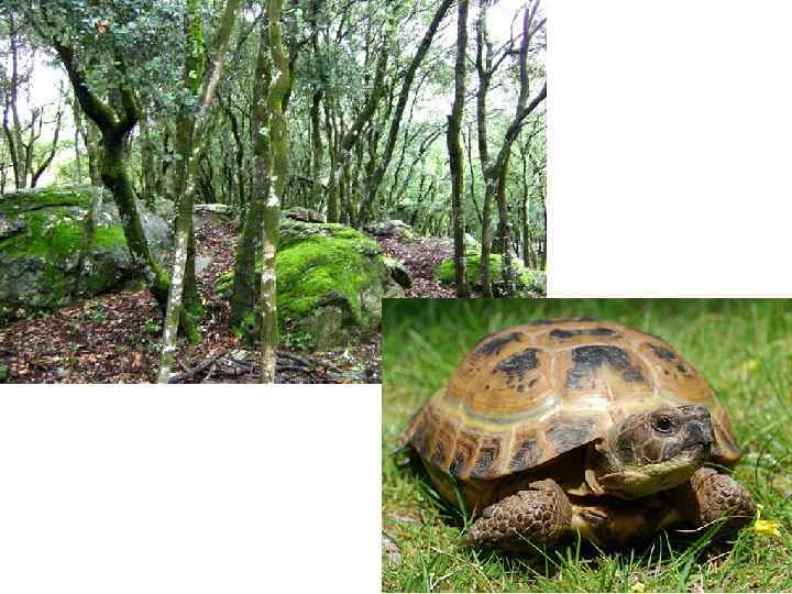 Жестоколистные леса и кустарники • вечнозелёные дубы и различные хвойные (сосны, кедры), можжевельники, благородный лавр, земляничное дерево, ежегодно сбрасывающее кору, дикие маслины, розы • Черепахи, гекконы