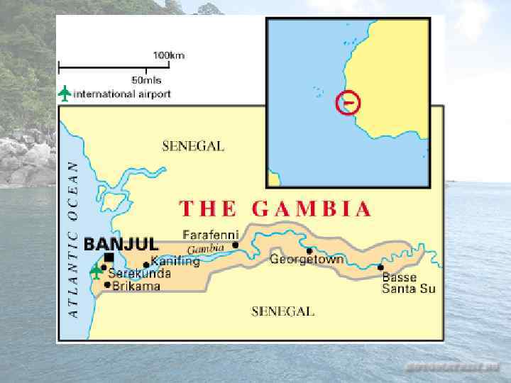Гамбия • Республика Гамбия — государство в Западной Африке. • Является самым маленьким государством в континентальной части Африки. • На севере, востоке и юге окружена Сенегалом, на западе имеет небольшую береговую линию Атлантического океана. • Гамбия входит в Содружество наций. • Через всю территорию страны с востока на запад протекает река Гамбия