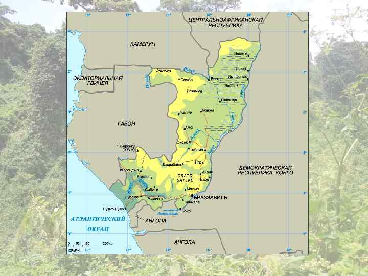 Общая информация Ø Государство расположено на западе Центральной Африки. Ø Граничит на севере с Камеруном и ЦАР, на западе - с Габоном, на востоке - с ДРК, на юге - с Анголой. Ø На юго-западе имеет выход к Атлантическому океану. Ø Республика Конго лежит на правом берегу реки Конго, давшей стране название. Ø Большая часть территории - влажные полулистопадные, вечнозеленые тропические и мангровые леса. Ø Центральную и южную части страны занимают саванны. Ø У местного населения Конго с давних пор существует богатый и самобытный фольклор, но письменная литература появилась лишь после Второй мировой войны. Ø Литературные языки — французский и лингала.