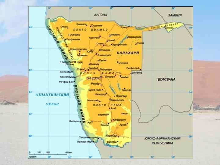 Общая информация v Республика Намибия, государство на юго-западе Африки. v На западе омывается водами Атлантического океана, на севере граничит с Анголой и Замбией, на востоке - с Ботсваной, на юго-востоке и юге - с ЮАР. v Численность населения Намибии 1870 тыс. человек (данные 2000). v Столица - Виндхук (210 тыс. жителей). v Население - 1870 тыс. человек (2000). v Плотность населения - 2, 3 человека на 1 кв. км. v Городское население - 38%, сельское - 62%. v Самая высокая точка - гора Брандберг (2579 м).