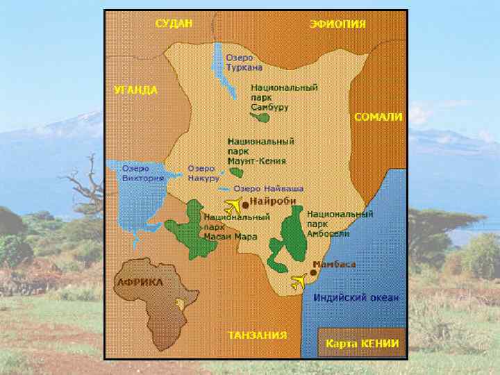 Кения • Республика Кения расположена на восточноафриканском побережье Индийского океана. • Ее площадь - 580, 4 тыс. км 2 • Население - 39 млн человек • Столица - Найроби. • Экватор пересекает страну почти посередине. • Климатические условия кенийского нагорья считаются одними из лучших в Африке. • Температурный режим прибрежных вод способствует развитию пляжно-купального отдыха. • На западе часть границы страны проходит озером Виктория. На севере расположено самое большое озеро Кении - Рудольф. Большинство озер сильно засолены. • Исключительно разнообразны ландшафты, растительный и животный миры Кении.