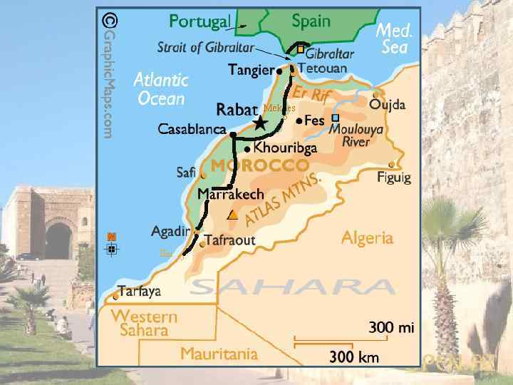 Общая информация Ø Марокко – это страна на северо-западном побережье африканского континента. Средиземное море и Атлантический океан омывают берега Марокко. Ø Климат этой страны зависит от морских течений и ветров. Ø От Европы Марокко отделяет Гибралтарский пролив, а с юга к берегу подступает пустыня Сахара. Ø Население этой страны - около 35 миллионов марокканцев.