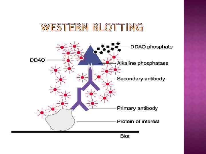 1. Separation of proteins using SDS PAGE 2. Transfer of the proteins onto e. g. a nitrocellulose membrane (blotting) 3. Immune reactions 4. Visualization
