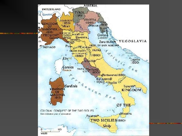 Italian Unification • Division of Italy: • Bourbon king ruled Kingdom of Two Sicilies, • Pope governed Papal States, • Habsburg princes ruled duchies of Tuscany, Parma, Modena • Piedmont and Sardinia ruled by House of Savoy (Italian) n Forces against unification of Italy n Except for middle Class most Italian clung to values of Old Regime n Peasants and ruling class rejected values of Enlightenment and French Revolution n Religious people and traditionalists rejected unity (Pope must rule Rome and Central Italy) n Forces for unification of Italy n Middle class merchants and manufacturers (they wanted r. r. and roads, abolish taxes on trade goods from one part of Italy to another, standardized weights, measures, and coins, wanted greater opportunity) n Students – influence of Romanticism; the “glorious past” of the Roman Empire