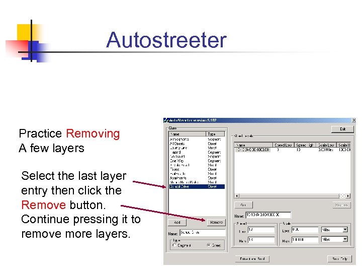 Autostreeter Practice Removing A few layers Select the last layer entry then click the Remove button. Continue pressing it to remove more layers.