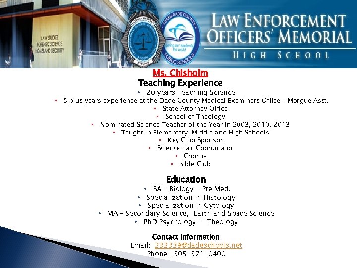 Ms. Chisholm Teaching Experience • 20 years Teaching Science • 5 plus years experience at the Dade County Medical Examiners Office – Morgue Asst. • State Attorney Office • School of Theology • Nominated Science Teacher of the Year in 2003, 2010, 2013 • Taught in Elementary, Middle and High Schools • Key Club Sponsor • Science Fair Coordinator • Chorus • Bible Club Education • BA – Biology – Pre Med. • Specialization in Histology • Specialization in Cytology • MA – Secondary Science, Earth and Space Science • Ph. D Psychology - Theology Contact Information Email: 232339@dadeschools. net Phone: 305 -371 -0400