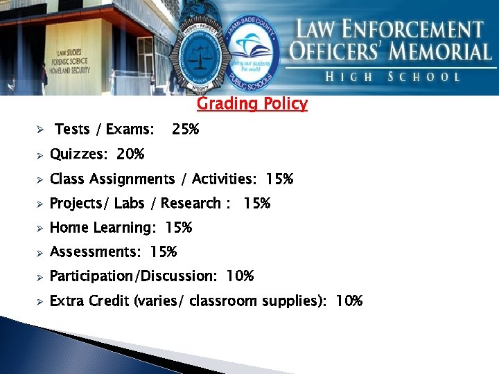 Grading Policy Ø Tests / Exams: 25% Ø Quizzes: 20% Ø Class Assignments / Activities: 15% Ø Projects/ Labs / Research : 15% Ø Home Learning: 15% Ø Assessments: 15% Ø Participation/Discussion: 10% Ø Extra Credit (varies/ classroom supplies): 10%
