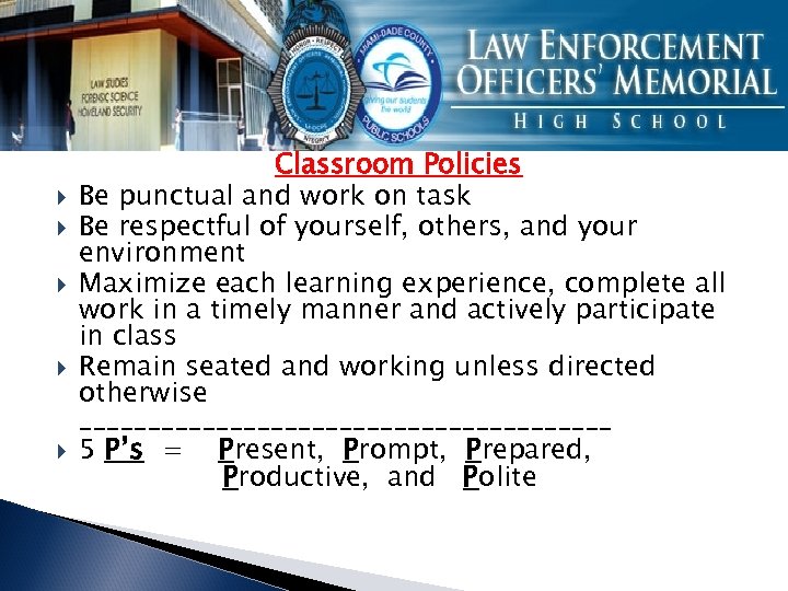 Classroom Policies Be punctual and work on task Be respectful of yourself, others, and your environment Maximize each learning experience, complete all work in a timely manner and actively participate in class Remain seated and working unless directed otherwise ____________________ 5 P’s = Present, Prompt, Prepared, Productive, and Polite