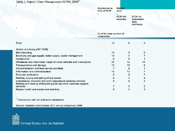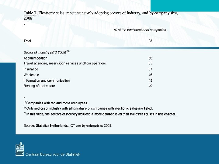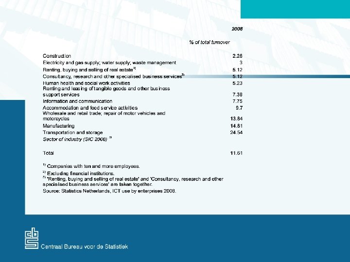 • Survey: Automation and ICT (2000 -2008) – 2008: • % of turnover generated via a public website • % of turnover generated via automated data exchange or other private systems • Total e-turnover: the Netherlands, EU, non-EU • % of purchases generated via electronic networks • Total e-purchases: the Netherlands, EU, non-EU • Definition (Eurostat, OECD): "Placing or receiving orders for goods or services through electronic networks, regardless (!) of delivery and payment methods. Excluding orders by telephone, fax, or conventional e-mail. "