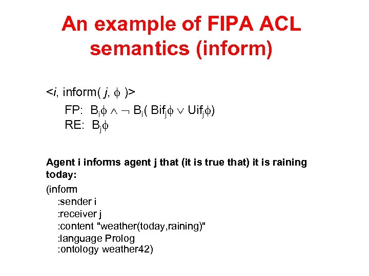 An example of FIPA ACL semantics (inform) FP: Bi Bi( Bifj Uifj ) RE: Bj Agent i informs agent j that (it is true that) it is raining today: (inform : sender i : receiver j : content "weather(today, raining)" : language Prolog : ontology weather 42)