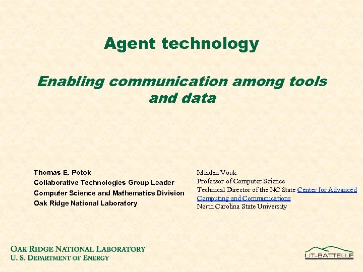 Agent technology Enabling communication among tools and data Thomas E. Potok Collaborative Technologies Group Leader Computer Science and Mathematics Division Oak Ridge National Laboratory Mladen Vouk Professor of Computer Science Technical Director of the NC State Center for Advanced Computing and Communications North Carolina State University