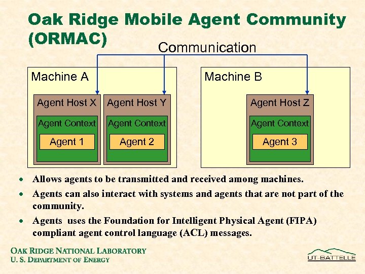 Oak Ridge Mobile Agent Community (ORMAC) Communication Machine A Machine B Agent Host X Agent Host Y Agent Host Z Agent Context Agent 1 Agent 2 Agent 3 · Allows agents to be transmitted and received among machines. · Agents can also interact with systems and agents that are not part of the community. · Agents uses the Foundation for Intelligent Physical Agent (FIPA) compliant agent control language (ACL) messages.