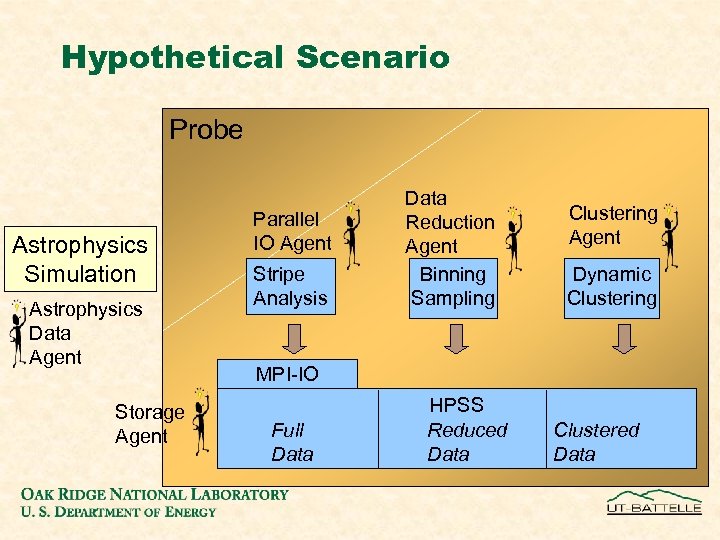 Hypothetical Scenario Probe Astrophysics Simulation Astrophysics Data Agent Storage Agent Parallel IO Agent Stripe Analysis Data Reduction Agent Binning Sampling Clustering Agent Dynamic Clustering MPI-IO Full Data HPSS Reduced Data Clustered Data
