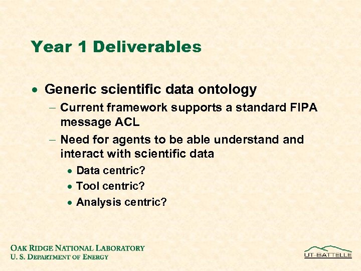 Year 1 Deliverables · Generic scientific data ontology - Current framework supports a standard FIPA message ACL - Need for agents to be able understand interact with scientific data · Data centric? · Tool centric? · Analysis centric?