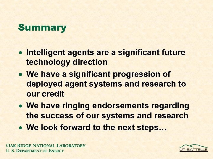 Summary · Intelligent agents are a significant future technology direction · We have a significant progression of deployed agent systems and research to our credit · We have ringing endorsements regarding the success of our systems and research · We look forward to the next steps…