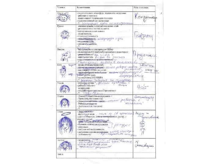 A. 1. Команда Человек Алина Руслан Никита Компетенции Роль в команде - умеет создавать атмосферу, поднимать настроение Координатор - работает с текстами - координирует творческого процесса - художественный взгляд на вещи -генерирует идеи (женский вариант генератора) - знает японский язык (базовый уровень) - систематизация, интеграция и синтез идей Генератор идей - разносторонний взгляд на жизнь - коммуникационные навыки - умеет мечтать - стрессоустойчивость - генерирует идеи (мужской вариант генератора) - хорошо выступает на людях (артистичен) Продажник - пользователь ПК (работает в различных редакторах) - не ссыт - подмечает детали - организует работу в коллективе