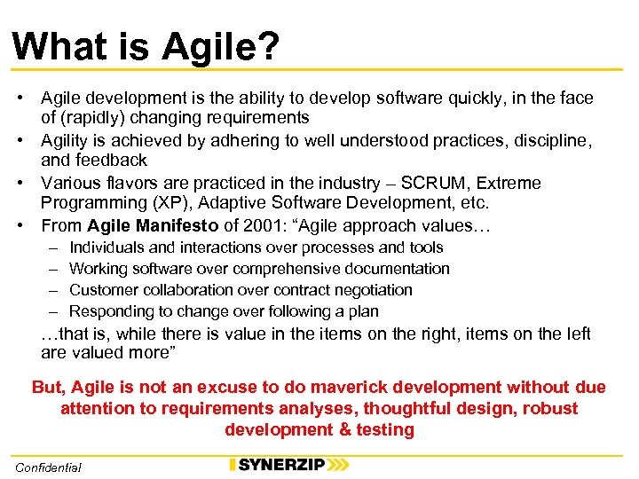 Agile Approach @Synerzip • Next few pages lay out the general approach of Agile development followed at Synerzip • This is a highly collaborative process, across distributed teams, including client and Synerzip professionals • This general approach is applicable to all software development & testing projects, e. g. – – New Product Development Ongoing Maint/Enhancement of Existing product Configuration/Integration of Enterprise Software Development of QA Automation Framework • The very nature of Agile process is that it is flexible and adaptable in different client/project situations • While process adaptability/flexibility is an asset, we still need follow a minimum level of software engineering discipline – “hygiene” as described in following pages. Confidential