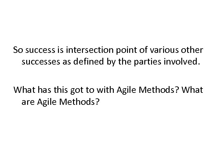 So success is intersection point of various other successes as defined by the parties involved. What has this got to with Agile Methods? What are Agile Methods?