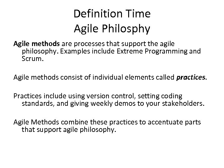 Definition Time Agile Philosphy Agile methods are processes that support the agile philosophy. Examples include Extreme Programming and Scrum. Agile methods consist of individual elements called practices. Practices include using version control, setting coding standards, and giving weekly demos to your stakeholders. Agile Methods combine these practices to accentuate parts that support agile philosophy.