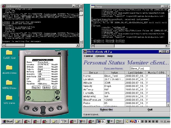 e. Gent DEMO Purpose • e. Gent. Grid. Agent proxy is used to connect (wireless) e. Gents in the field to grid-accessible agents on a LAN Demo scenario • PSMs on troops updated with latest status information (geographic, health, threat, …) • other parties (PSM clients like command post or medevac) subscribe and receive inform messages in response to changes Displays • PSM Server is displayed in one Java window • DOS windows show activity of the e. Gent. Grid. Agent proxy and Grid's log agent • PSM Grid Client is displayed in another Java window • Netscape Messenger shows the log of e. Gent messages Demo step-through shows • registering the PSM Server e. Gent with the e. Gent. Grid. Agent proxy which then registers it with the Grid • switching to the PSM Client agent, which subscribes to the PSM Server by sending a lookup message to the Grid Registry, which finds the proxy, which the client thinks is the PSM Server, and then sends a subscribe grid message to the proxy, which passes it along to the PSM Server • then PSM Server sends back an inform message containing the subscribed values (and sends updates later if any values change) • the messages thread their way back through the system to eventually be displayed on the client. • if you modify a value on the server, you can watch the update propagated back to the client • you can view the e. Gent message log with Netscape Messenger.