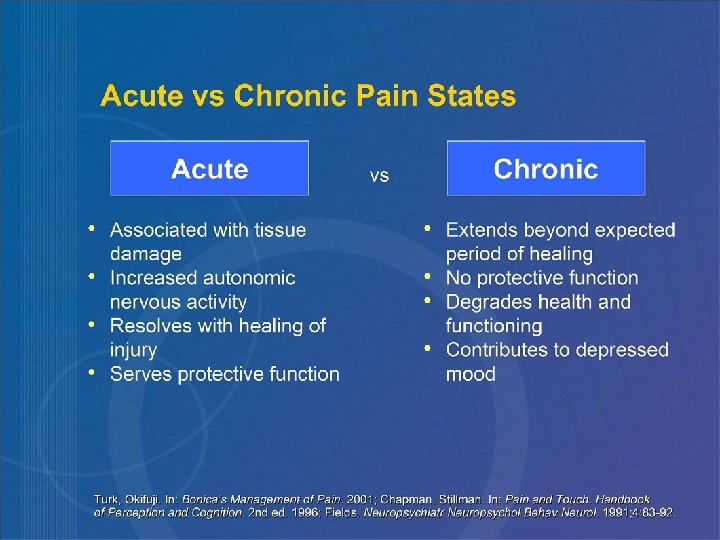 Effects of Chronic Pain on the Patient l Physical Functioning/Quality of Life: -ability to perform ADLs -sleep disturbances l Social Consequences: -Relationship with family & friends -intimacy/sexual activity -social isolation l l Psychosocial Morbidity: -depression -anxiety -anger -loss of self esteem Societal Consequences -healthcare costs -disability -lost workdays