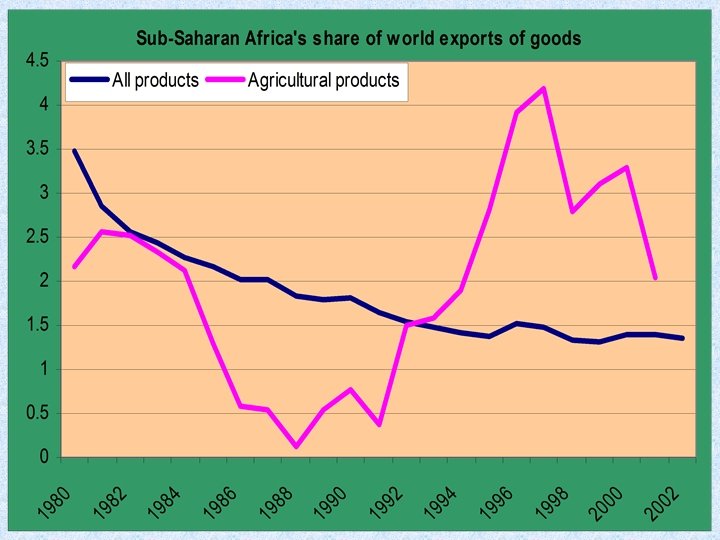 International Trade Context: Marginalization of Sub-Saharan Africa q Africa’s output has changed very little since 1970: it continues to be overwhelmingly dominated by few primary commodities, with low value added, mainly agricultural products and natural resources q As a result African economies are undiversified and extremely vulnerable to terms of trade and exogenous shocks q Capital flights, brain drain of skilled workers, and lack of economic diversification are major constraints with tremendous implications for investment, employment creation, export potentials and macroeconomic stability.