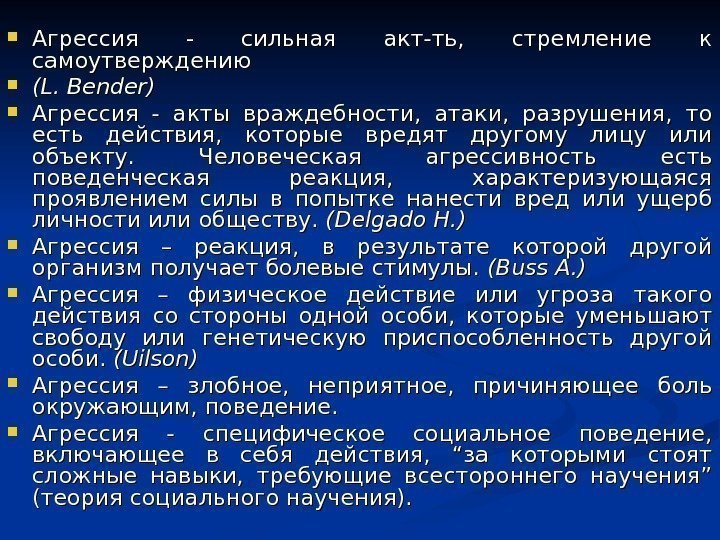 Агрессия — сильная акт-ть, стремление к самоутверждению (( LL. . BB ender) Агрессия — акты враждебности, атаки, разрушения, то есть действия, которые вредят другому лицу или объекту. Человеческая агрессивность есть поведенческая реакция, характеризующаяся проявлением силы в попытке нанести вред или ущерб личности или обществу. (Delgado H. ) Агрессия – реакция, в результате которой другой организм получает болевые стимулы. (Buss A. ) Агрессия – физическое действие или угроза такого действия со стороны одной особи, которые уменьшают свободу или генетическую приспособленность другой особи. (Uilson) Агрессия – злобное, неприятное, причиняющее боль окружающим, поведение. Агрессия — специфическое социальное поведение, включающее в себя действия, “за которыми стоят сложные навыки, требующие всестороннего научения” (теория социального научения).