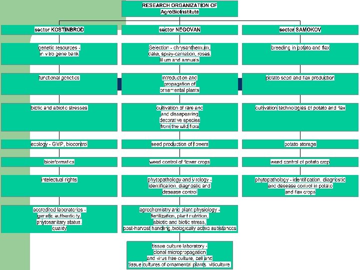 STRUCTURAL UNITS OF AGROBIOINSTITUTE (ABI) – KOSTINBROD, BULGARIA l l Ministry of Agriculture and Forestry National Centre of Agricultural Sciences (NCAS) – Regulations for NCAS, 28. 12. 2000 AGROBIOINSTITUTE: l Institute of Genetic Engineering (IGE) – Kostinbrod l Institute of Floriculture – Negovan l Complex Experimental Station with an Experimental Field – Samokov