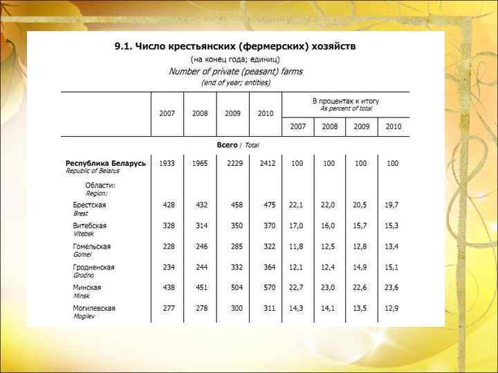Рентабельность реализованной продукции на конец 2009 года составляла 26, 5 % по Гомельской области, а на конец 2010 года она увеличилась на 17, 9 % и составила 44, 4 %. Что касается убыточных крестьянских (фермерских) хозяйств, то их доля снизилась в 2010 году, по сравнению с 2009, на 1, 3 % и составила 5, 7 % от общего количества.