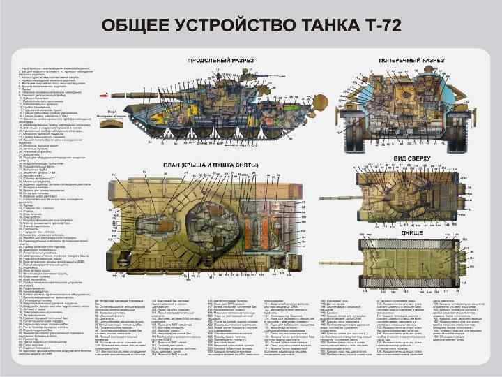 Т-72 Длина, м 9, 5 Высота по крыше башни, м 2, 19 Ширина, м 3, 6 Боевая масса, т 41 Полная масса, т 44, 5 Двигатель многотопливный четырехтактный дизель Мощность л. с. (к. Вт) 840 (618) Трансмиссия механическая планетарная Подвеска торсионная Гусеница с РМШ (или с ОМШ) Максимальная скорость, км/ч 60 Дальность, км 550 -650 Преодолеваемые препятствия, м - высота стенки 0, 85 - глубина водного препятствия 1, 8 - с подготовкой 5 - ширина рва 2, 8 Броня противоснарядная комбинированная Вооружение 125 -мм гладкоствольная пушка - пусковая установка, пулемет ПКТ. Запас боеприпасов 39 снарядов, 300 патронов калибра 12, 7 и 2000 - 7, 62 Типы боеприпасов БПС, БКС, ОФС, УР Комплекс управляемого вооружения 9 К 120 Управляемая ракета 9 М 119 с управлением по лучу лазера Дальность стрельбы, м 100 -4000 Дальномер лазерный Заряжание автоматическое Пулеметы один 12, 7 -мм, один 7, 62 -мм Броневая защита комбинированная Динамическая защита навесная Стабилизатор 2 Э 42 -2 с электромашинным приводом горизонтального наведения Экипаж, чел 3 Производитель Уралвагонзавод Год принятия на вооружение 1976