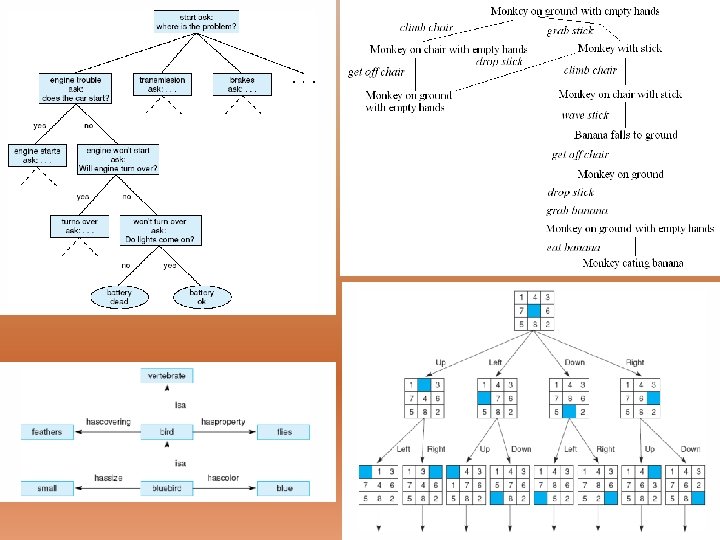 Search Spaces and Types of Search • The search space consists of all possible states of the problem as it is being solved – A search space is often viewed as a tree and can very well consist of an exponential number of nodes making the search process intractable – Search spaces might be pre-enumerated or generated during the search process – Some search algorithms may search the entire space until a solution is found, others will only search parts of the space, possibly selecting where to search through a heuristic • Search spaces include – – – Game trees like the tic-tac-toe game Decision trees (see next slides) Combinations of rules to select in a production system Networks of various forms (see next slides) Other types of spaces