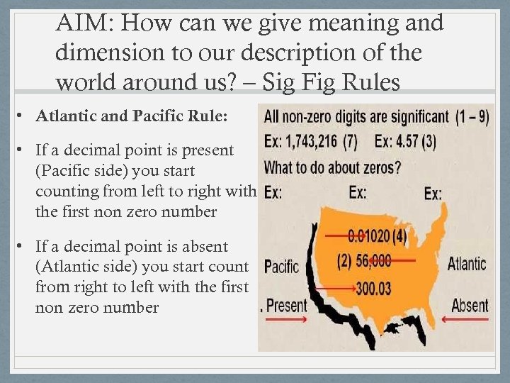 AIM: How can we give meaning and dimension to our description of the world around us? – Sig Fig Rules • Atlantic and Pacific Rule: • If a decimal point is present (Pacific side) you start counting from left to right with the first non zero number • If a decimal point is absent (Atlantic side) you start count from right to left with the first non zero number