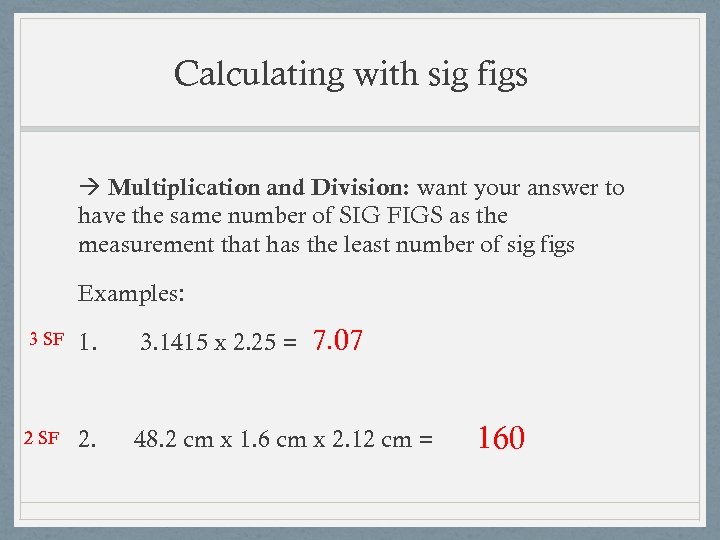 Calculating with sig figs Multiplication and Division: want your answer to have the same number of SIG FIGS as the measurement that has the least number of sig figs Examples: 3 SF 1. 3. 1415 x 2. 25 = 7. 07 2 SF 2. 48. 2 cm x 1. 6 cm x 2. 12 cm = 160
