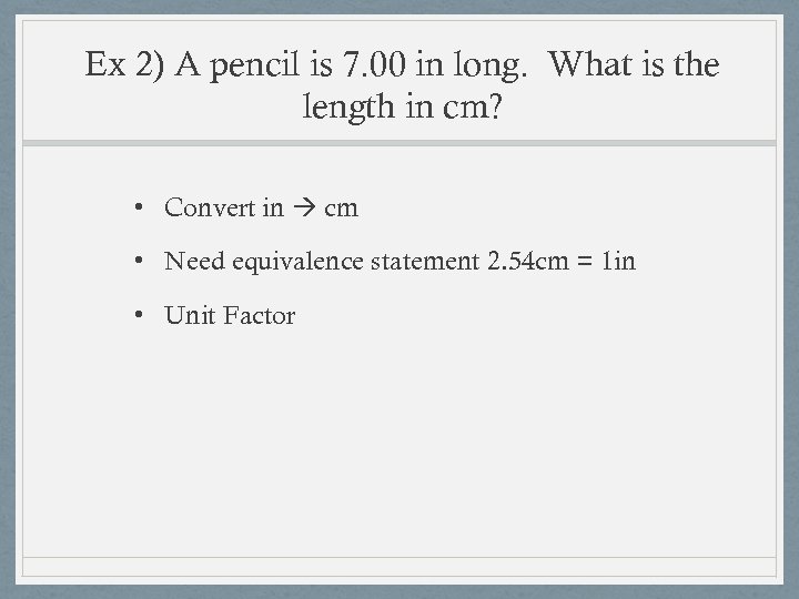 Ex 2) A pencil is 7. 00 in long. What is the length in cm? • Convert in cm • Need equivalence statement 2. 54 cm = 1 in • Unit Factor