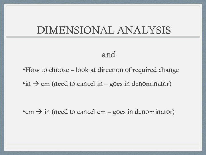 DIMENSIONAL ANALYSIS and • How to choose – look at direction of required change • in cm (need to cancel in – goes in denominator) • cm in (need to cancel cm – goes in denominator)