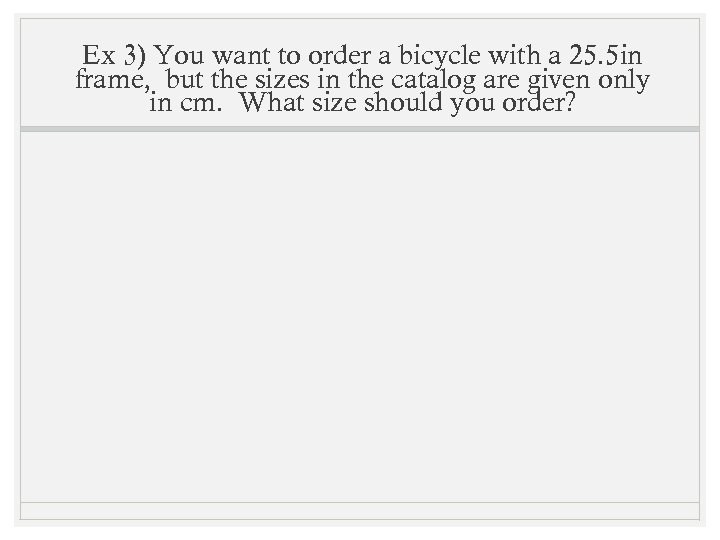 Ex 3) You want to order a bicycle with a 25. 5 in frame, but the sizes in the catalog are given only in cm. What size should you order?
