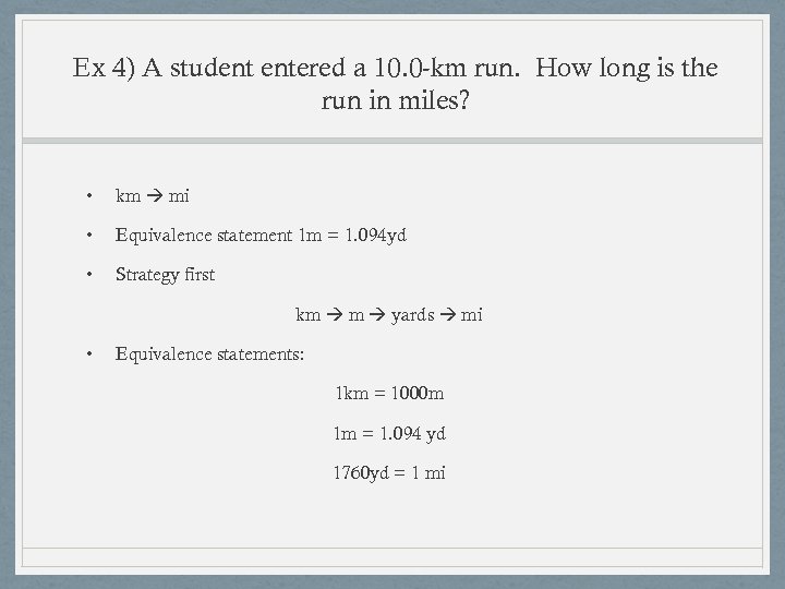 Ex 4) A student entered a 10. 0 -km run. How long is the run in miles? • km mi • Equivalence statement 1 m = 1. 094 yd • Strategy first km m yards mi • Equivalence statements: 1 km = 1000 m 1 m = 1. 094 yd 1760 yd = 1 mi